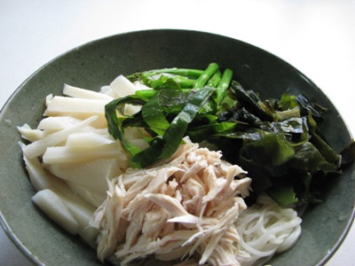 雞絲要好吃還是有一點秘訣,帶皮雞胸肉一大片放上蔥薑片,灑上少許鹽、酒,再放進電鍋蒸,放涼後,去皮撕成絲,灑上一些蒸出的雞湯泡著,如此雞絲的味道比較鮮美。如果不急著吃,放涼之後放進冰箱一晚,如此可以撈掉雞油,這時再稍稍加熱讓結凍的雞汁溶化,肉撕成絲再淋上去。