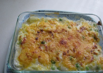 焗烤的材料依家裡有的做調整,這次用的是大白菜、冷凍青豆、培根里肌。鍋子燒熱,先炒培根再加入大白菜、青豆,接著加入少許水,大白菜煮軟即可。接下來是重點,沒有加白醬而是加入攪拌了麵粉的牛奶,倒進去煮開煮糊了,加入鹽、黑胡椒即可。將飯拌進去,盛入焗烤盤,灑上起士,用小烤箱烤到表面金黃即可。