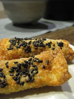 餛飩皮可以包的東西很多,今年過年請客是包了年糕、起士跟肉餡,為了區隔,包肉的對摺成三角形,起士跟年糕雖都是長方形,包年糕的外皮沾點芝麻變化。