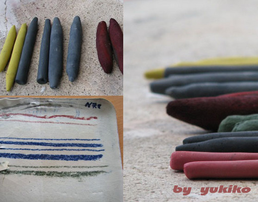 其實陶藝材料行也有蠟筆可買,但自己做其實也不難,說不定還可以開發出更多的顏色。材料只是簡單的蛙目土跟色料,蛙目土是一種黏土,色料在陶藝材料店有售,35%的色料加上15%的蛙目土,倒進研磨鉢,用杵子磨勻,加入少許的水,可以成型即可。50公克可以揉成長條型兩條,陰乾之後,基本上需要用350度烤乾,台灣的烤箱只有250度,因此我另想辦法。