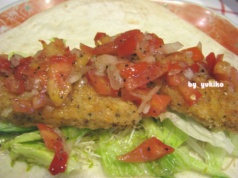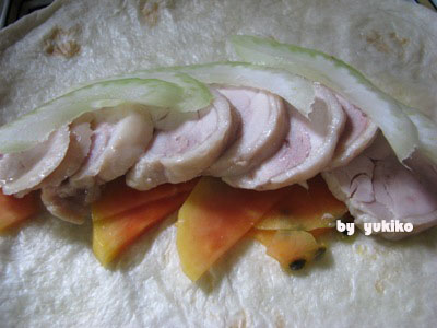 市面上賣的炸雞塊烤一下配生菜,自己做的醉雞配木瓜小菜也不錯。拿一張餅皮,放點苜蓿芽,最好先加莎莎醬,接著放肉,最後放生菜,用手壓緊再捲起來。