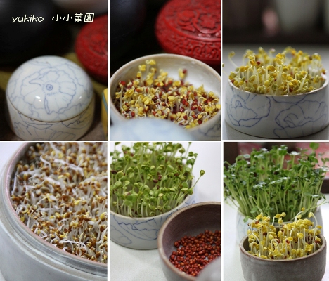 打開盒蓋後,需注意水分蒸發掉時要加水。我的經驗,種子泡兩天好像冒的比較快。苜蓿芽的種子要稍多,不要只是平鋪一層。