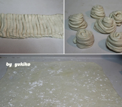 7 一團團的麵糰,從上面押平,再桿成薄圓餅狀