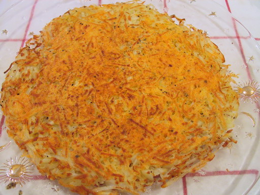 4 熱平底鍋,放兩大匙油,舖上馬鈴薯絲(大概大的一粒),灑上鹽胡椒,中火煎約7、8分鐘,底焦黃翻面,由邊邊再淋上兩大匙油,再煎到焦黃即可。 (在瑞士這道馬鈴薯餅是厚約兩三公分,兩邊脆中間軟,但我家的小孩喜歡吃薄的)