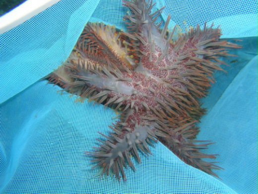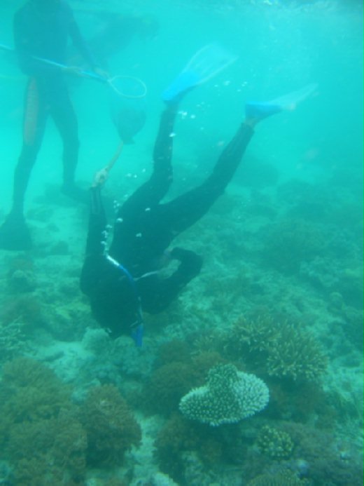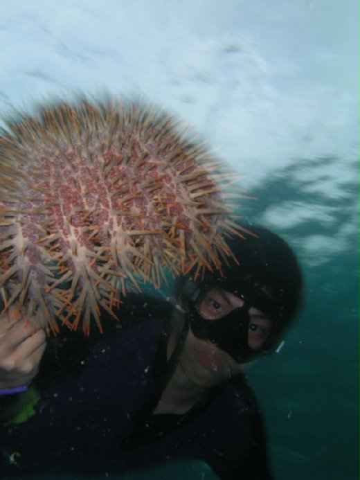 最後一天,兒子跟他表弟兩個人,因為魔鬼海星有毒,絕對不能用手抓,一個拿棍子,一個拿斷掉的珊瑚,便下水去除害。抓到之後便拿上岸,由在岸上的女兒跟表哥處理。原本泡在海水Spa裡的我,看著他們兩人拿著木塊,對著沙灘上的海星砍呀砍的,不禁好奇的跑過去看。海星在他們的摧殘下,血肉糢糊,粉紅色的糊狀,有如電影星際怪物般的特效一般,接著將它鏟進他們挖的洞裏。不久我們的潛水領隊Jackie也加入,拿了一根網子下去撈。如此不再拿上來,女兒忍不住,裝備穿好也游了過去。