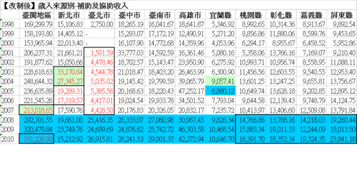 從資料上2000-2007 年平均補助總額約2000億,2008以後馬政府擴大為3100億,年差1100億。四年下來,擴大支出光是直接撥給地方,花在地方人民身上,就增加約4400億元。