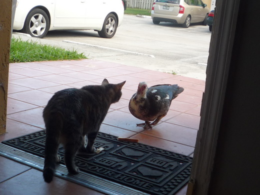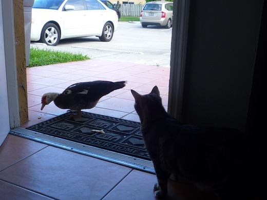 註:看著我家的叮噹貓,拉長身子想和外頭吃麵包的鴨子做朋友,