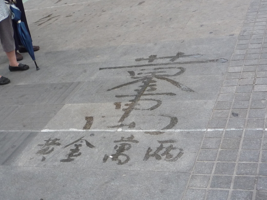 最令我嘖嘖稱奇的,是一位老伯,手拿著拖把似的大毛筆,沾著水桶裡的水,順手就在路邊練起了字,那「水筆字」寫得行雲流水,把大街當成了九宮格,自在極了。