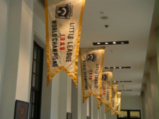 裡面展示一台古早電視機轉播古早少棒賽,