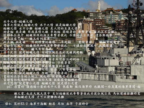 ps: 念書時 讀過楊小雲的水手之妻 很感動 服役海軍時 也聽聞一些美麗的海軍傳聞-錨鍊之愛