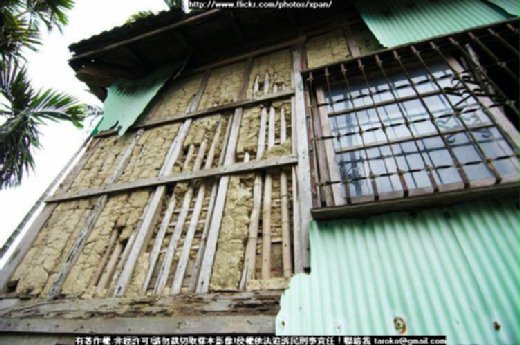 此棟竹管厝架構房子,年老面臨半崩塌,屋主用鐵板加蓋保護.只是這種方式能支撐多久?主管單位不重視台灣的鄉土建築,只會搞『意識型態愛台灣』,實際愛台灣行動卻沒有一點建設.