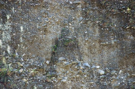 有一層高聳的礫石牆,注意看看裡面埋積的大小不一的礫石層,