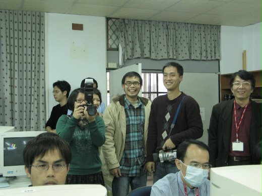 圖三:我常將學生大膽推出去見世面,讓他去接受風吹雨打太陽曬,初時常常狼狽難堪,幾次琢磨之後,越磨興致越盎然。阿蕭 (綠衣者)、景隆 (右二持攝影機者),是常被我徵調去支援各類DV&數位攝影的學生,從中,他們累積了經驗,琢磨了能力與膽量。