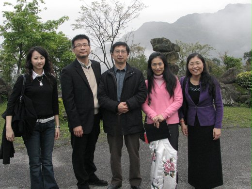 圖一:96年3月12日,中時電子報郭至楨總編輯(左二)、黃哲斌副總編輯(攝影者)、蔡子怡助理 (左一,也是華梵校友) 來訪,為後續合作開展新局。會後漫步校園,與華梵大學教務長蔡傳暉(左三)、教學卓越公關總監程如晞 (左四) 、師資培育中心主任陳雪麗 (左五) 攝於華梵大學「大崙攬勝」。華梵的靈秀仙境,可以成為多少傳播清流的搖籃!