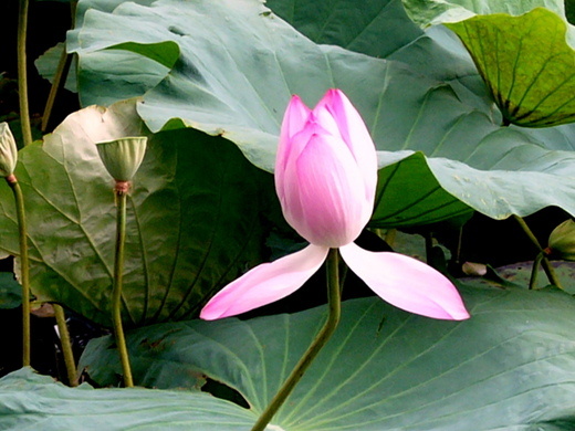 前天一家老小一起去台北市植物園的歷史博物館觀看大三國歷史文物展覽,當看罷走出史博館大門因時間還早,突然想到何不去植物園看夏荷,因為每年七月正是荷花盛開的季節,是賞荷最好的時機,更何況植物園那一片遼闊的荷塘就在距我們咫尺之地?於是我們繞過舊科學館經過一條林蔭小徑,從一個造型雅緻的旋轉門進入,一進園區驀的眼睛一亮,感覺到我們來到了另一個世界,剛剛南海路上還是車流滾滾,一下子一切噪雜已消失,取而代之的樹影婆娑亭台曲徑,一池荷葉隨風翩舞,幾莖花苞以芭蕾之姿婷婷嬝嬝的向遊客展現它們的容顏。