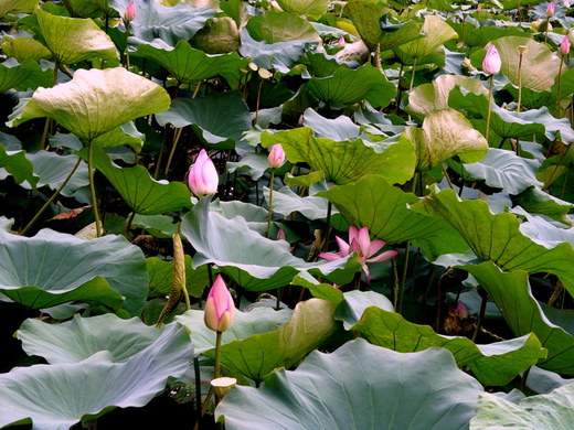 此時我想到朱自清的《荷塘月色》與漢樂府《江南》的詠荷詩詞為何能夠久久膾炙人口,我想前者有:『‥葉子出水很高,像亭亭玉立的舞女的裙。層層的葉子中間,零星的點綴著些白花,有嬝娜地開著的,有羞澀地打著朵兒的‥』美句。後者有:『江南可採蓮,蓮葉何田田。魚戲蓮葉間,魚戲蓮葉東。魚戲蓮葉西,魚戲蓮葉南,魚戲蓮葉北。』的妙詩,這些作品令人讀起不禁更加喜歡接近蓮池。