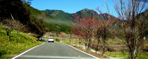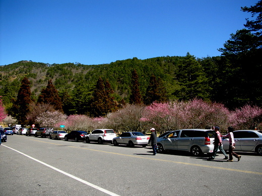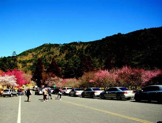 『勝日尋芳泗水濱,無邊光景一時新。等閒識得東風面,萬紫千紅總是春』,是的,武陵農場的春天夠得上稱萬紫千紅了,也可告我真的春天來了,不但在場本部一帶有深紅淺紅乳白等一片花海,由此向內直達桃山瀑布登山口,馬路兩旁成行成列繽紛縱橫,在綿延的山谷更是形成一條花的走廊。只可惜的是適逢春節假日車多人雜,所到之處無不人影雜沓萬頭攅動,要想找一個恰當的角度為花拍幾張相片也是一件很難的事。