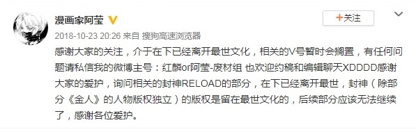 感谢大家的关注,介于在下已经离开最世文化,相关的V号暂时会搁置,有任何问题请私信我的微博主号:红麟or阿莹-废材组 也欢迎约稿和编辑聊天XDDDD感谢大家的爱护,询问相关的封神RELOAD的部分,在下已经离开最世,封神(除部分《金人》的人物版权独立)的版权是留在最世文化的,后续部分应该无法继续了,感谢各位爱护。