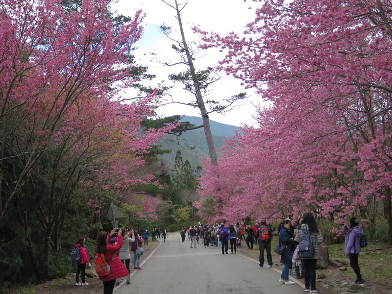 除了遊客聚集的櫻花隧道、遊客中心、醫療站兩側都是滿開的櫻花,再往山上走、往製茶廠、往露營區,沿路全都是滿滿的粉紅佳人櫻花!