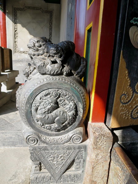 垂花儀門有的石雕還有以”馬上封候”、”吃各國”、”握全球”為題材,表現出張作霖的政治野心和抱負。