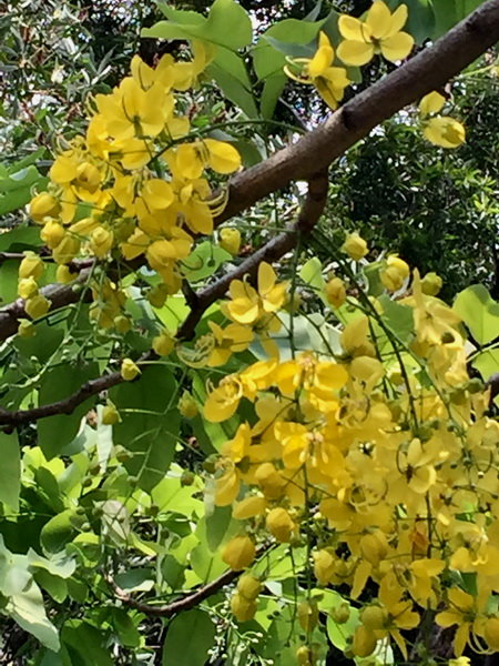 初夏滿樹金黃色花,花序隨風搖曳、花瓣掉落時,隨風紛飛,如細雨般飄落,所以它的英文名字就叫作「黃金雨」(Golden Shower )Tree。