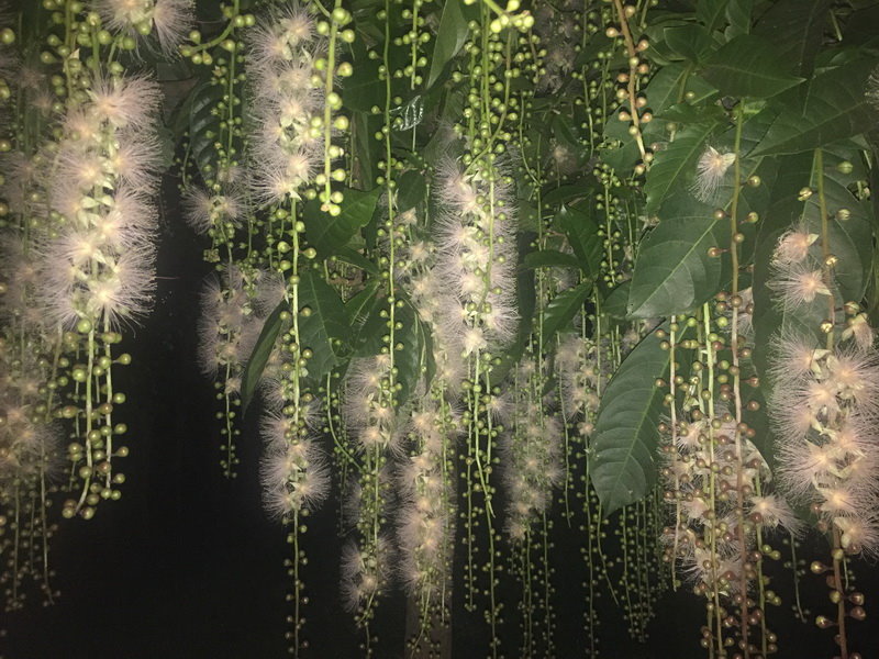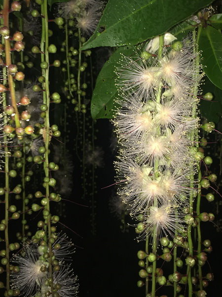 穗花棋盤腳似乎還不想開花ㄝ! 花穗約有一公尺長,白天只能看到一顆顆的花苞和果實,就像垂掛的珠簾。