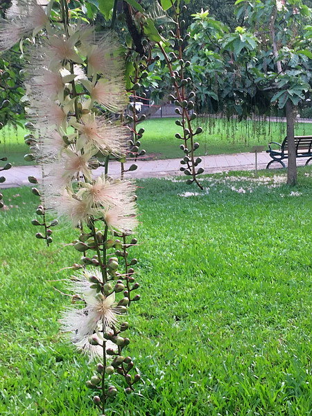 穗花棋盤腳是水陸兩棲植物,俗稱『水茄苳』,穗花棋盤腳就像串串珠簾,成串成串的開花,遠看像群聚的蝴蝶排列在一條樹藤上,近看又像白千層(奶瓶刷)…..