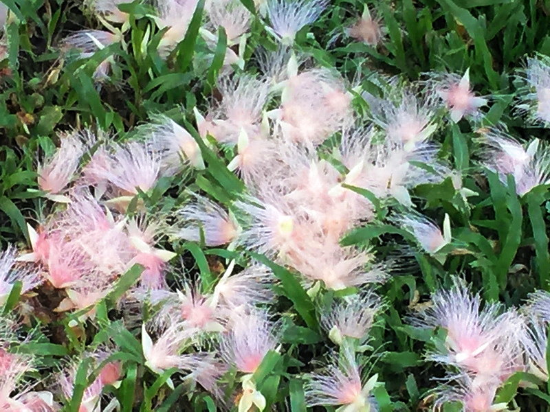 花實在好夢幻,花朵從樹上垂掛而下,一朵朵的有粉紅色、乳白色,毛毛的鬚鬚就像是花的觸角。