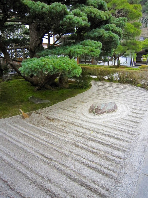 枯山水常被認為是日本僧侶用於冥想的輔助工具,所以幾乎不使用開花植物,這些靜止不變的元素被認為具有使人寧靜的效果。
