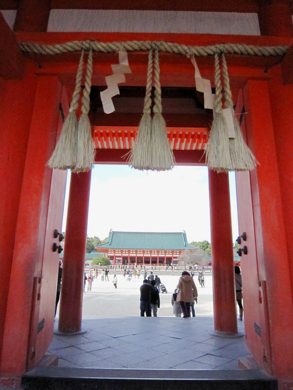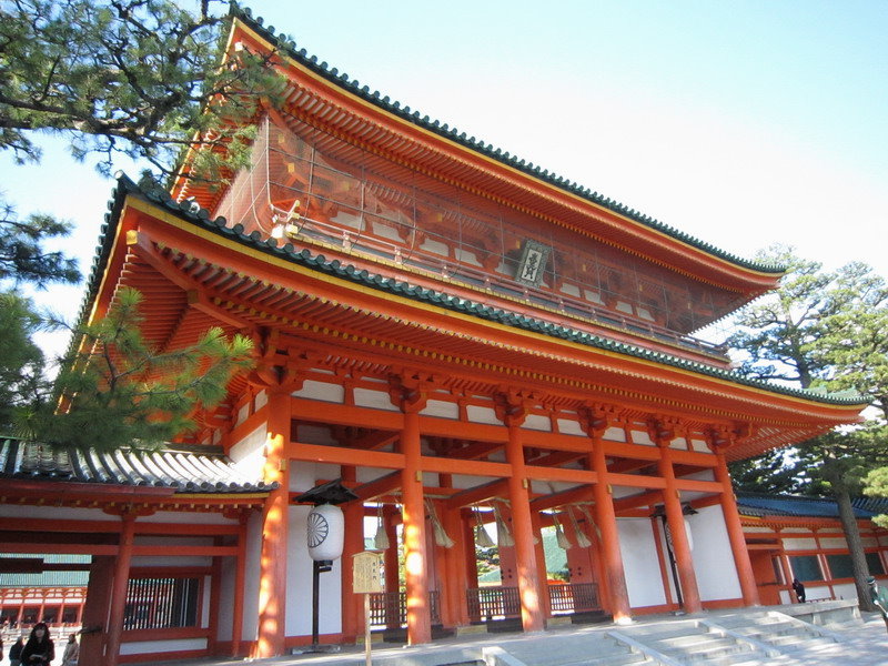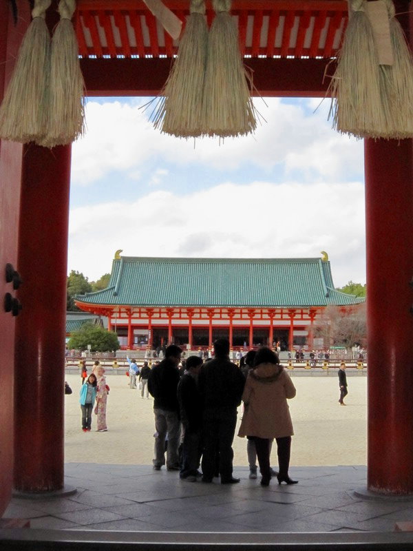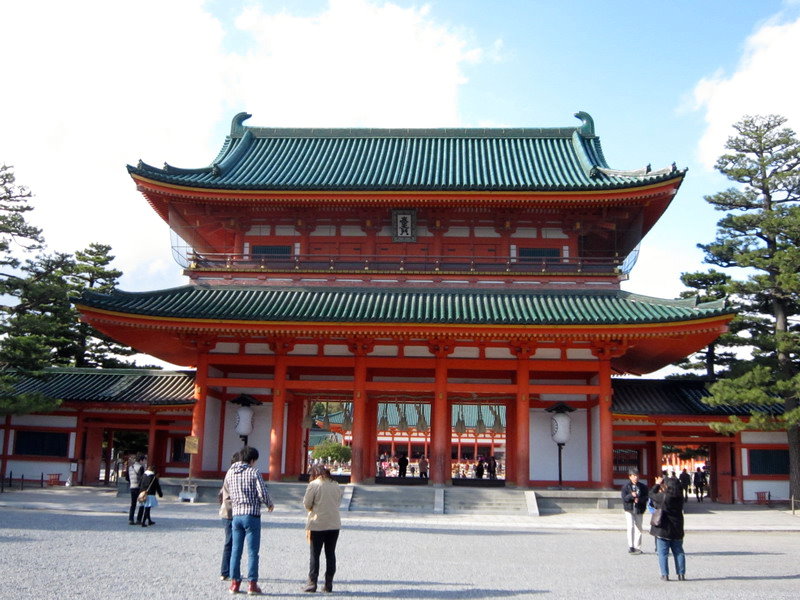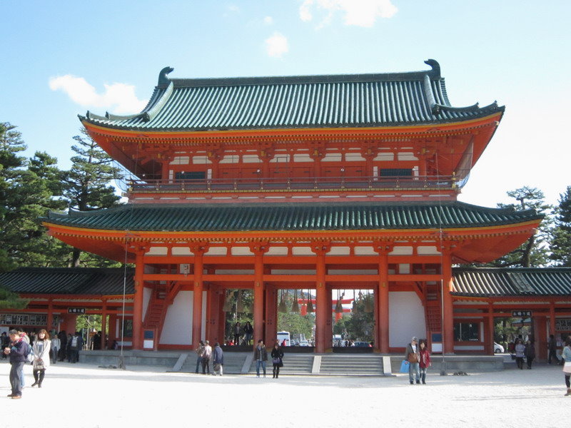 平安神宮是根據前平安京朝堂院建築以5/8的比例縮小重建,從入口處的應天門開始,就是依循著早期平安古都的「大内裏朝堂院」作完整的重現。