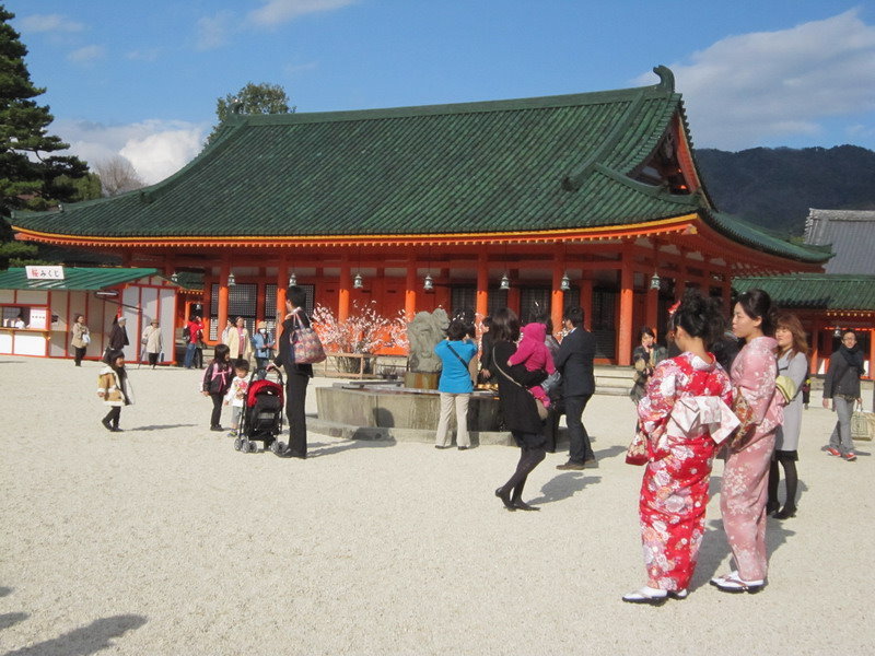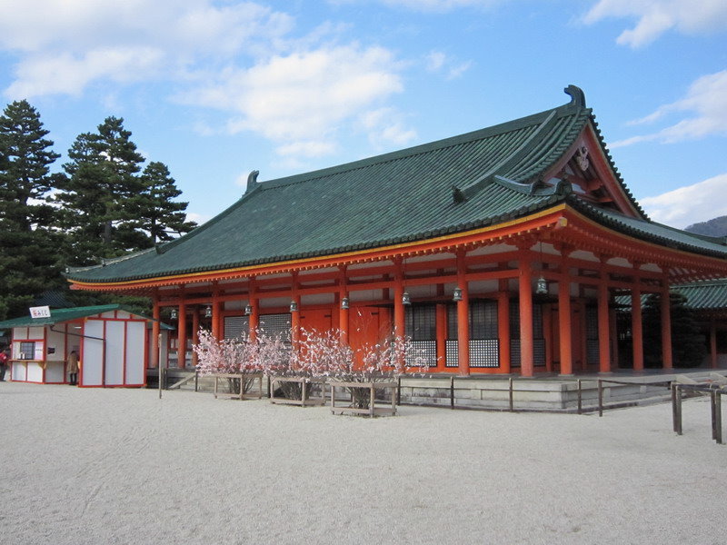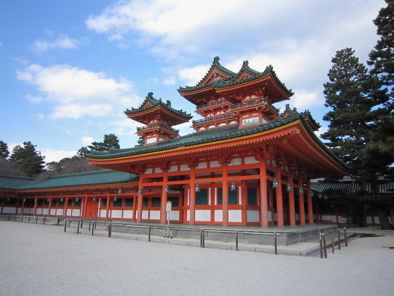 平時遊客來到平安神宮,站在白色玉砂粒舖設而成的廣場,可免費觀賞這些精雕細刻的朱紅樓宇。對稱型的設計,左右及前後都是相同的設計方式,看起來相當整齊且壯觀!