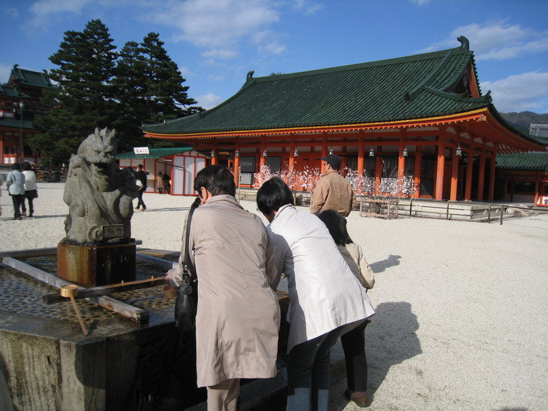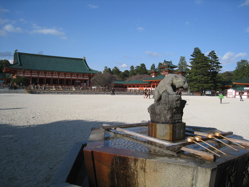 平安神宮主要祭奉桓武天皇以及孝明天皇,採用了左右對稱的的建築格局,首先看到左右兩邊的宮殿分別為神樂殿(結婚式場)與額殿,而兩個宮殿前也各有一個六角形的手水舍。