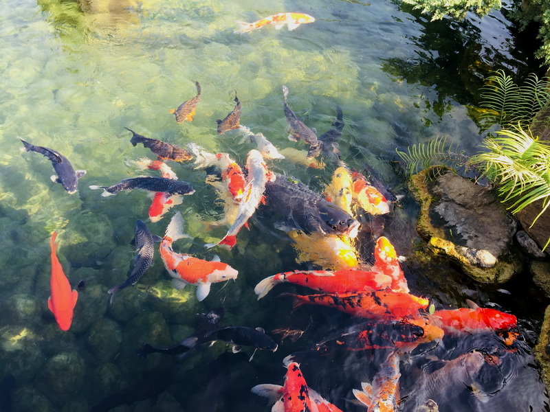 上池區水底鋪有綠色水草的石頭,魚兒水中遊…..