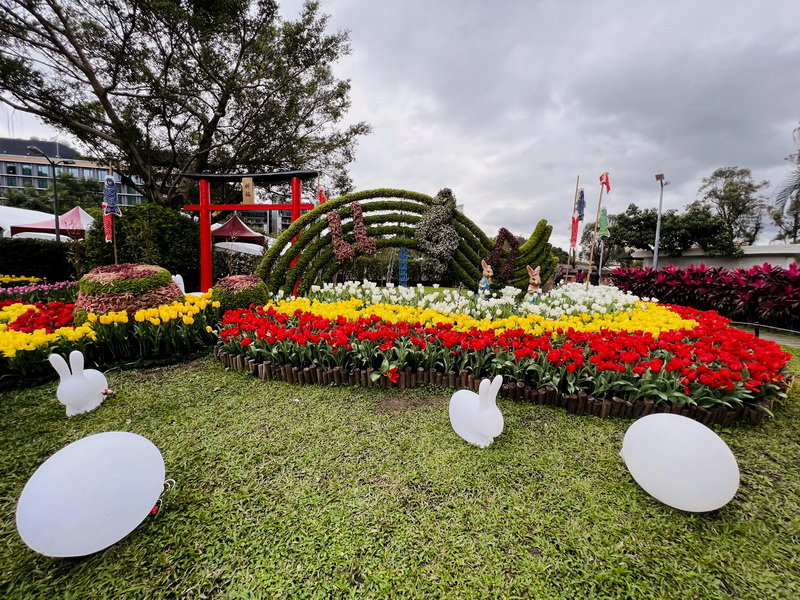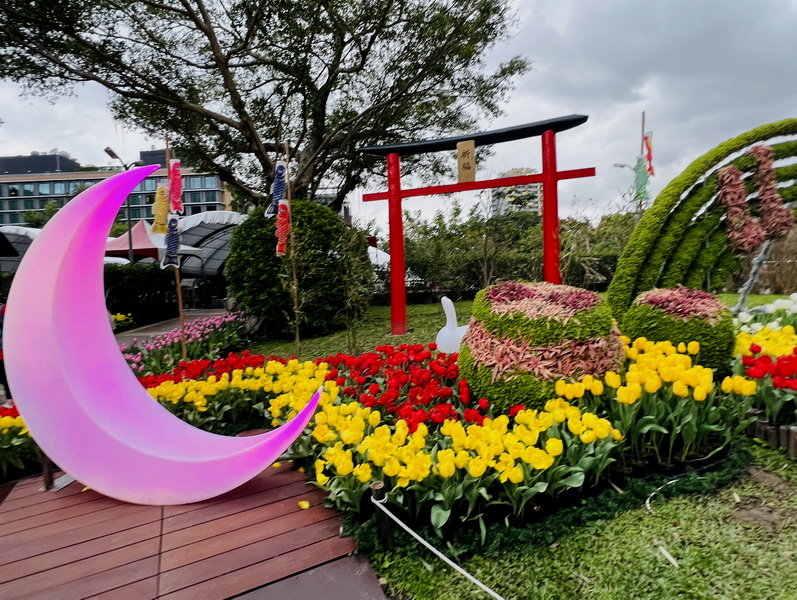 這次與日本礪波市合作展,出日本特有種鬱金香,特別以日本童話故事「竹取公主」為發想,以鳥居、月亮、月兔、紙鶴打造「竹取公主的夢幻世界」,讓民眾親身體驗童話裡的經典場景。