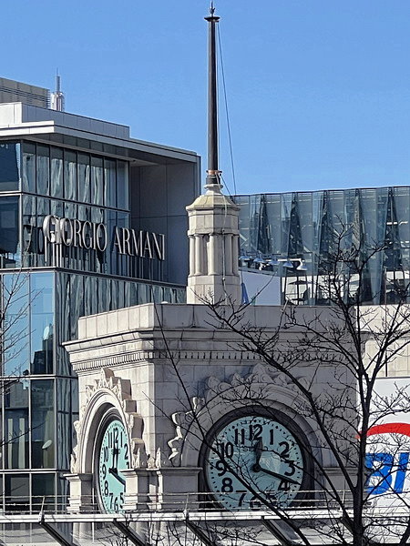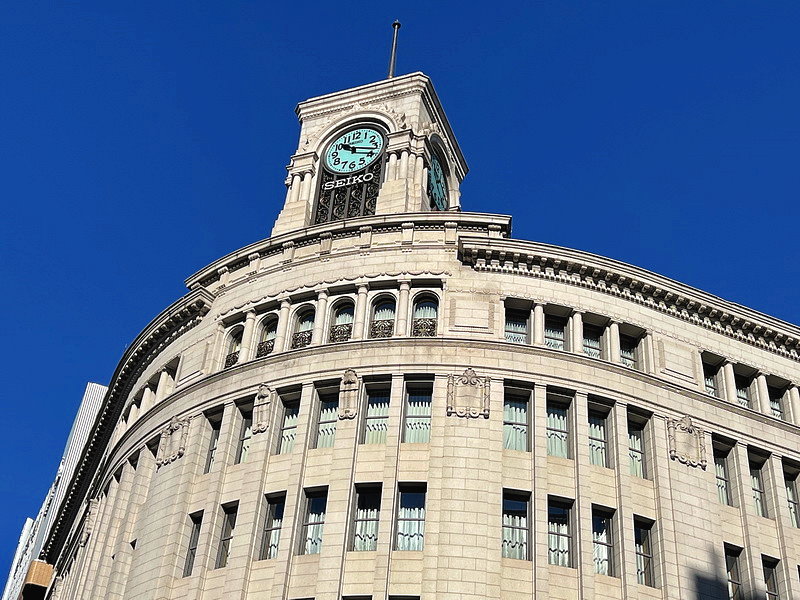 銀座四丁目古老大鐘的西洋建築,充滿新文藝復興的風格,弧形設計的大樓,橫跨十字路口的兩面,頂層的鐘塔樓高9米,四面的鐘盤則高約2.4米,每一面接近正向東南西北四個方位,居高臨下,俯視著銀座最繁華的路段。所以它不僅是銀座的地標,也是精工最具代表性的發源「地」。