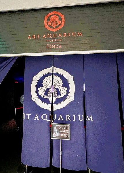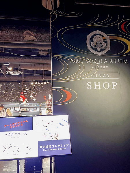 「Art Aquarium Museum GINZA」以水中舞者~金魚為主角,被譽為是「有生命的藝術館」,結合日本文化元素、聲光視覺、藝術花藝,打造極具感官震撼的金魚藝術展;這個展覽曾在海內外展出多次,累積觀展人數已超過千萬人;入口處的水族館家徽 家紋(かもん)以金魚呈現,如實地描述出展覽的主題。