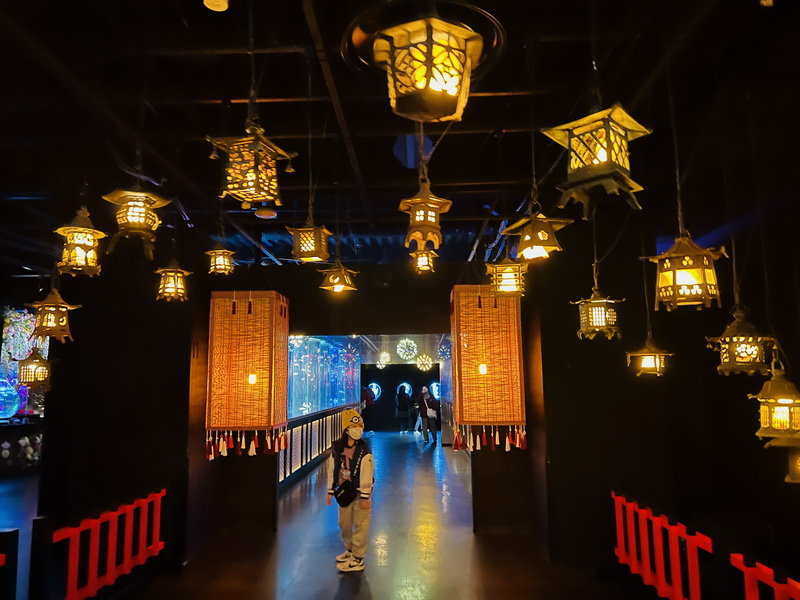 進入暖簾後,如夢似景的設計,引導我們進入一個只有日本文化才能營造出的魔幻空間,每個空間也各自有自己的主題,讓人目不暇及。入場後是銀座萬燈籠,在靜謐的空間中懸掛著發出幽暗燈光滿天的吊燈籠,這些多層懸掛的燈籠讓人想起奈良春日大社的燈籠,這些都是銀座藝術水族館收藏的歷史文物。