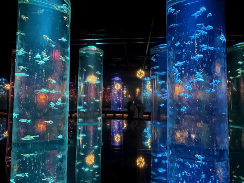 五彩繽紛的列柱不斷地變化色彩,光影效果為金魚悠遊的身影添加更多奇幻色彩,並且透過鏡面反射營造無限延伸的感覺。