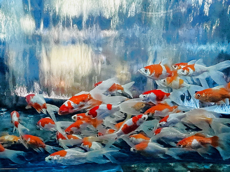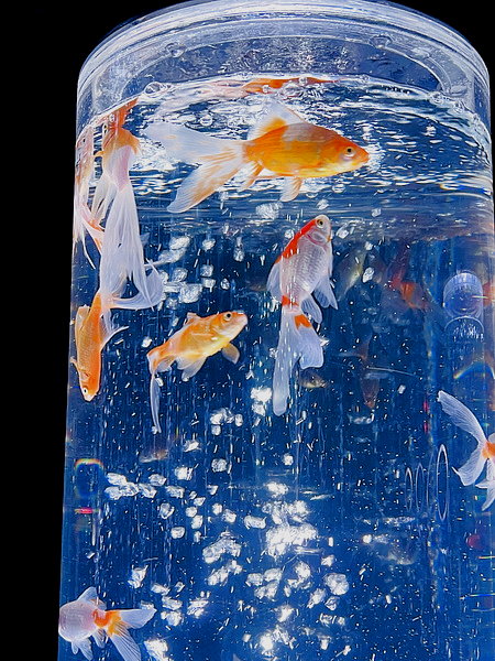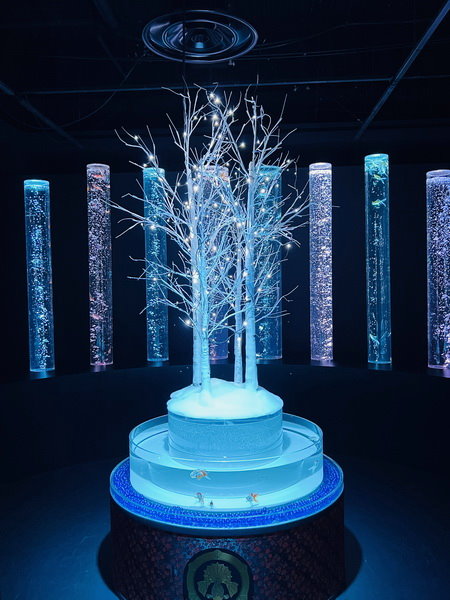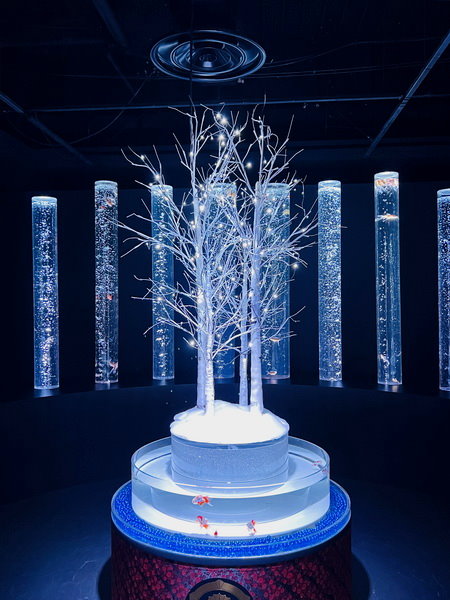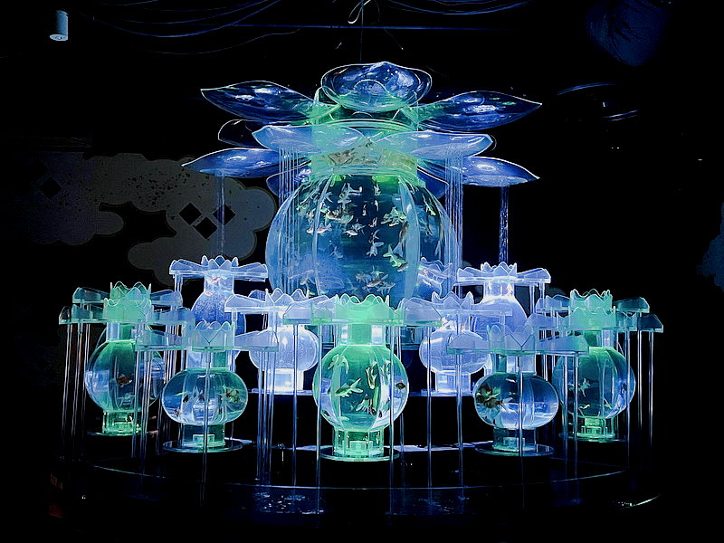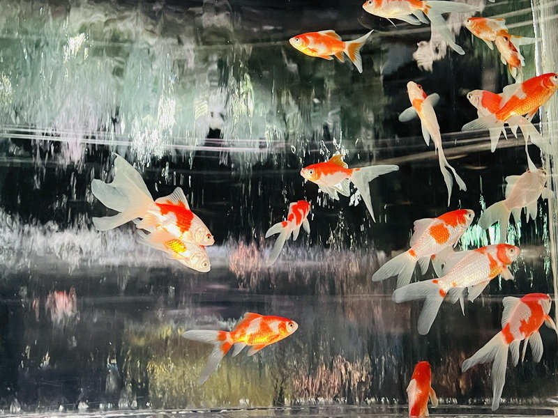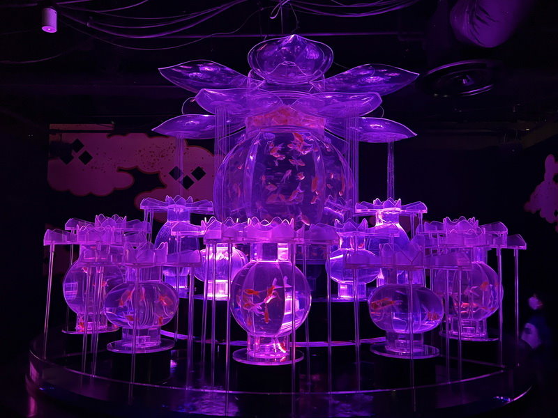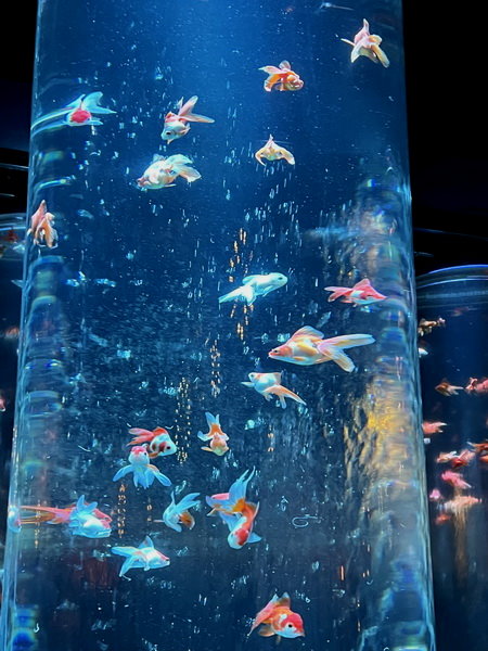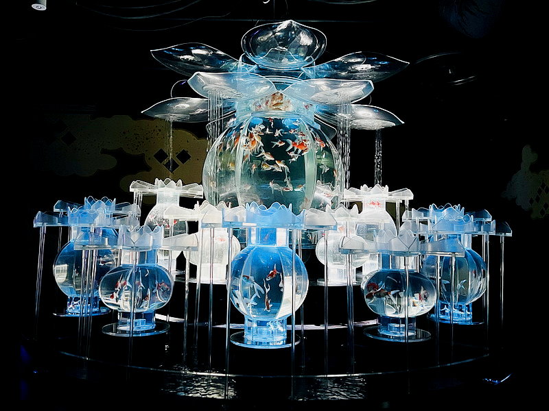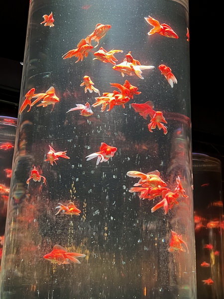 玻璃水槽中游動的各式金魚,搭配絢麗燈光和流暢的水流,讓人彷彿置身於流動的藝術品中。