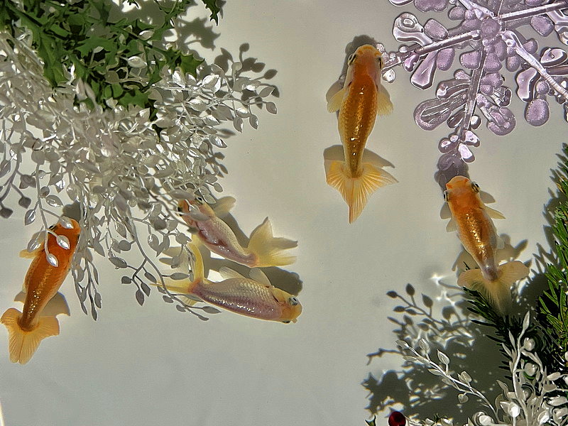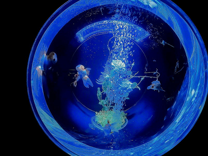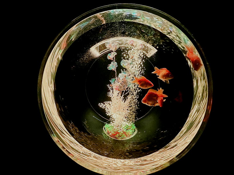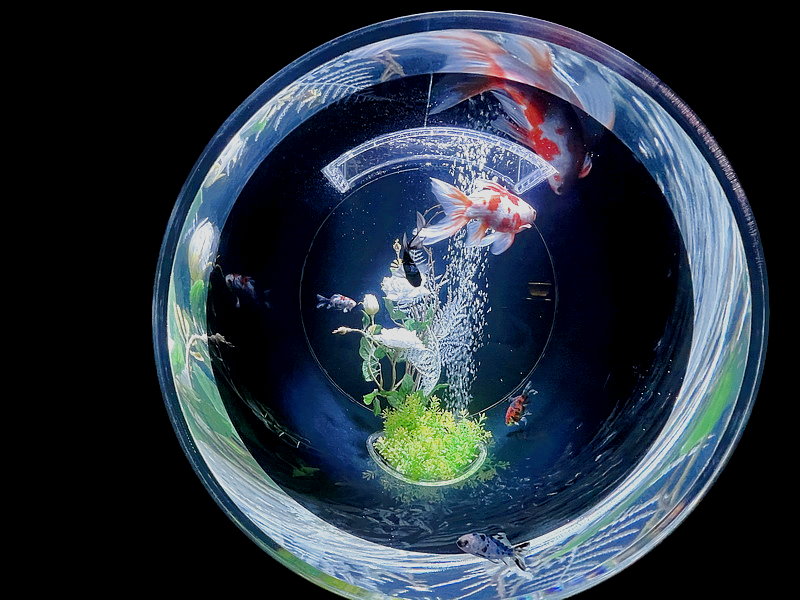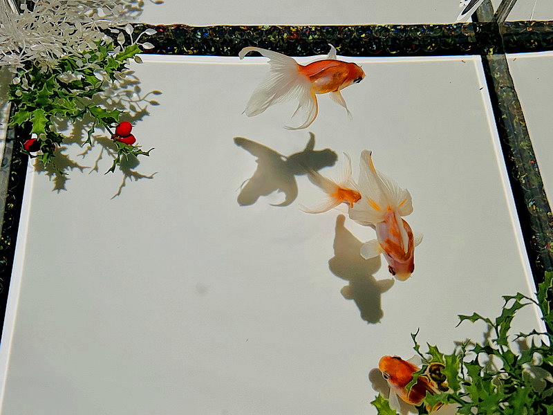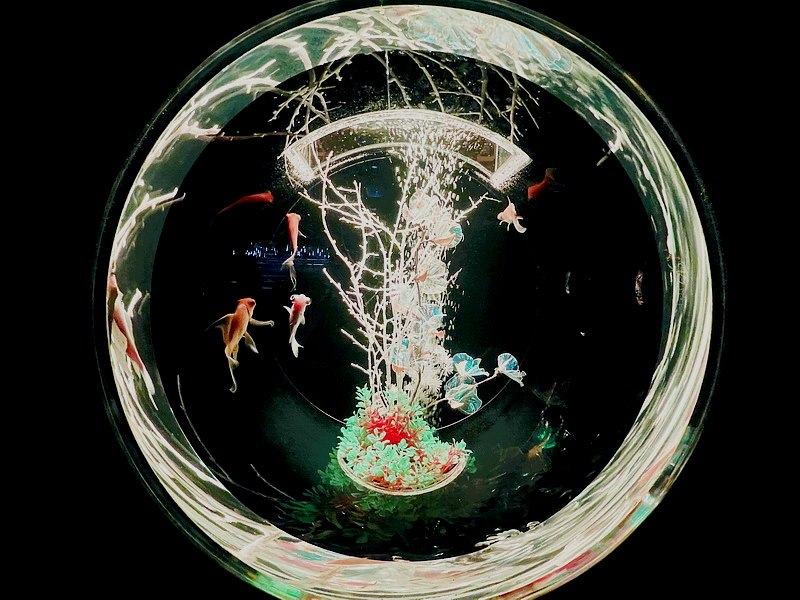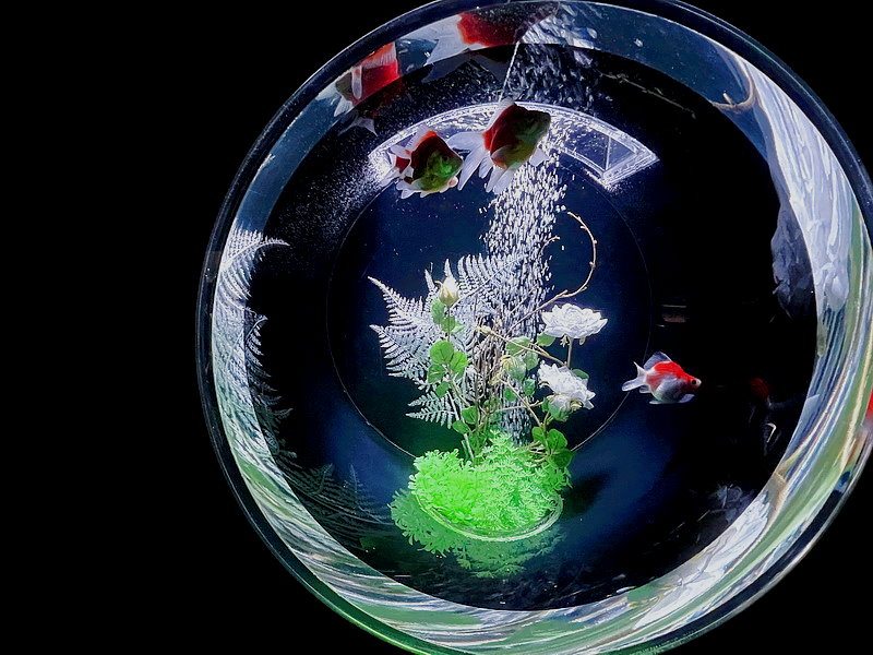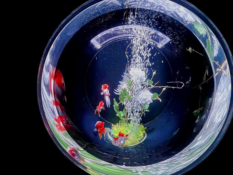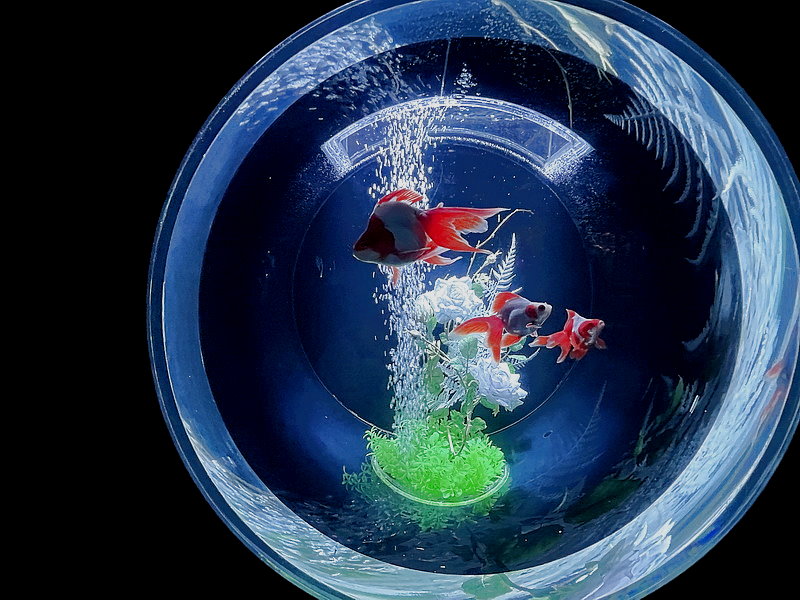 這些低矮的方形水族箱裡展示著不同品種的金魚,將各種不同品種的金魚放在正方形魚缸之中,以花與水草作為裝飾,俯瞰彷彿如一幅有生命力的畫,是個能從不同角度去欣賞金魚之美的作品。