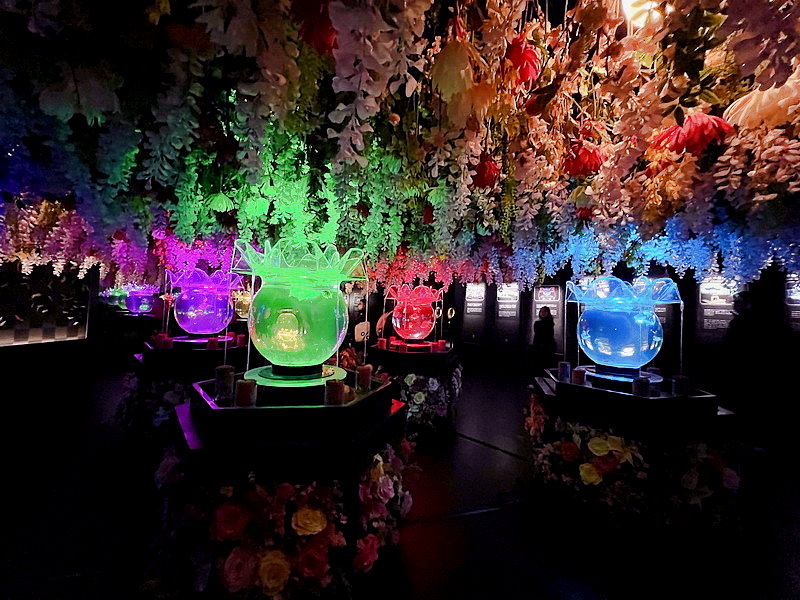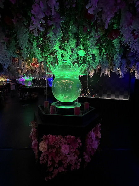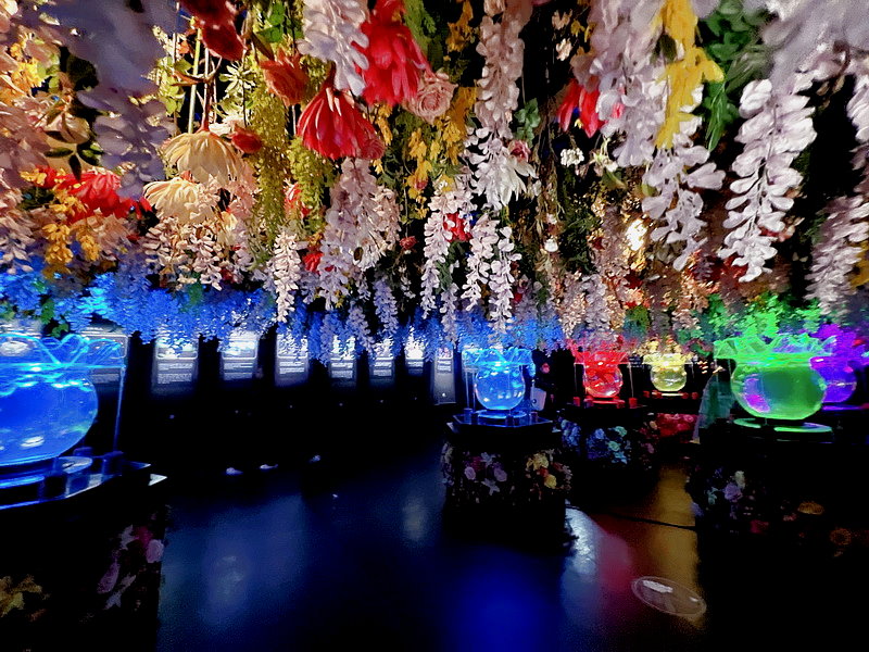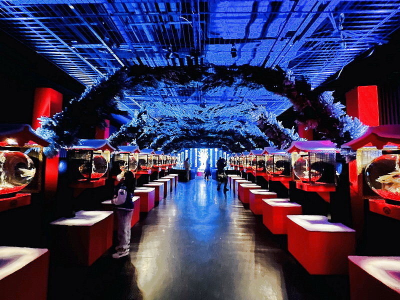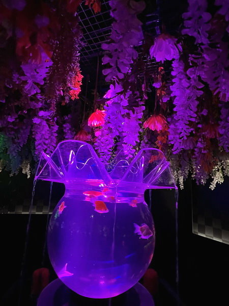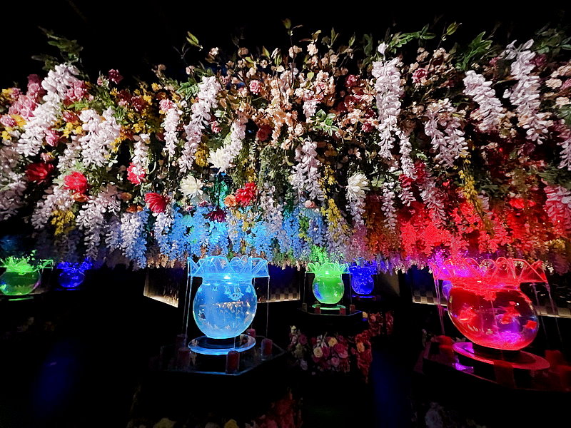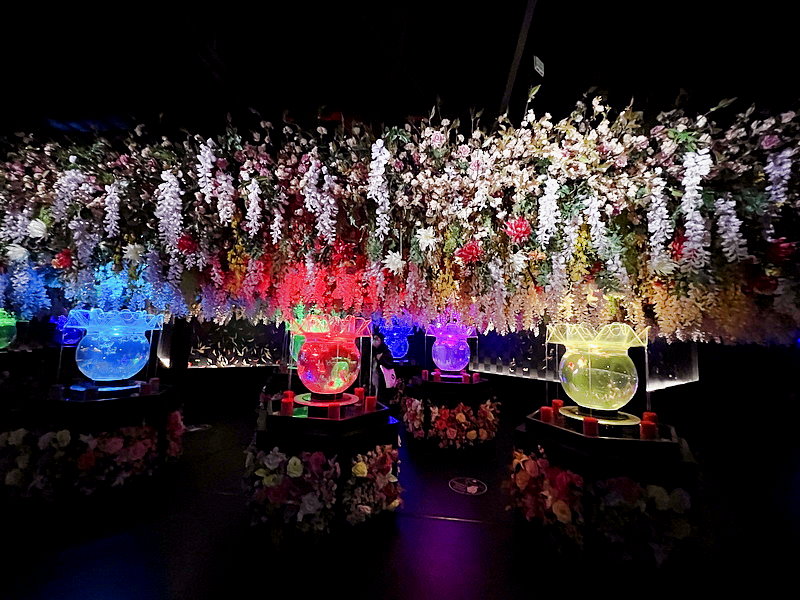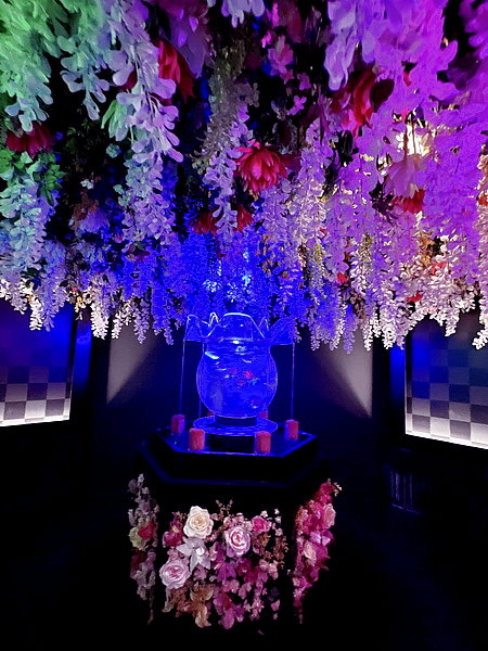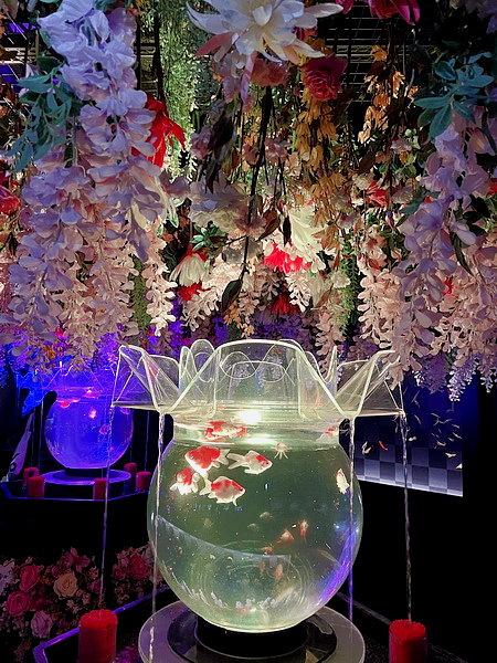 花魁花舞(Hanamai)整個展區佈滿各種鮮花,圍在魚缸的周圍與上方,形成一個優雅而華麗的沉浸式空間。這裡的設計不僅僅是展示金魚,而是將花朵與金魚完美融合,展現了如夢似幻的氛圍,特別適合那些熱愛拍照的朋友,每一個角落都像是一場藝術秀,讓人流連忘返!