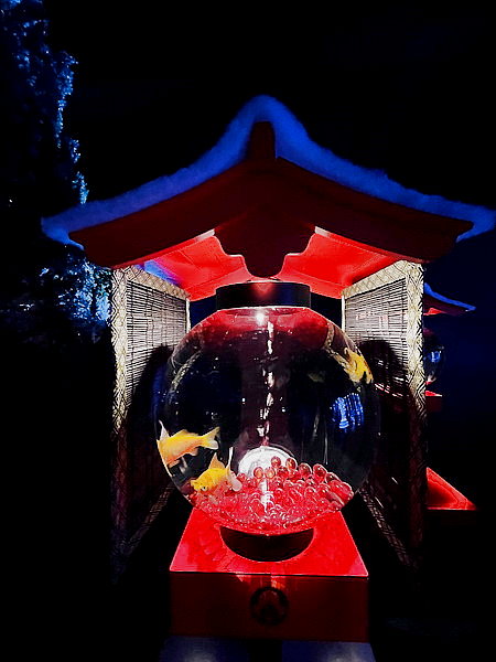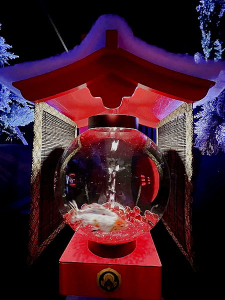 燈籠宴 (Teitourium)以日本傳統燈飾「Matsuri Toro」為靈感,將燈籠造型魚缸展示排列在兩側。以傳統日式燈籠為背景的展區,溫暖的燈光映照出金魚的身影,水光交錯的畫面宛如一場燈光秀,充滿藝術感。