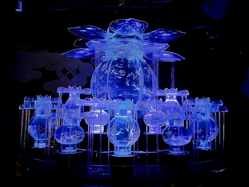 會場內用燈籠、手鞠、九谷燒、茶室紙門等傳統日式擺設,展示各種品種的金魚。金魚和水缸,搭配燈光、音樂和香氣,將會場妝點成讓人忘卻喧囂的非日常空間,是一座隨四季變化樣貌的常設設施。