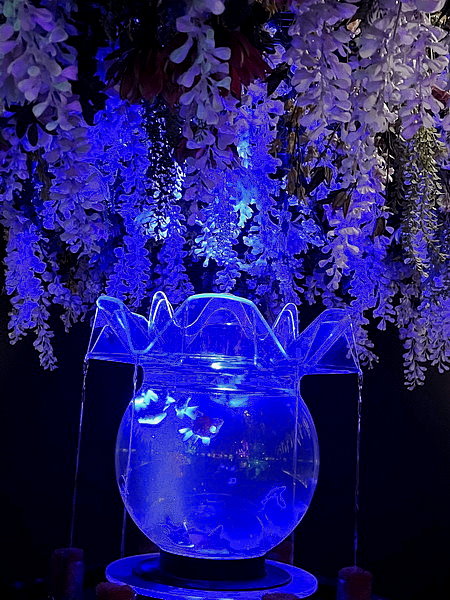 頭頂上繁花飄舞,彷彿走進了一片花田,是一片奇幻的幸福空間,欣賞金魚與插花結合的華麗之美。
