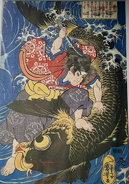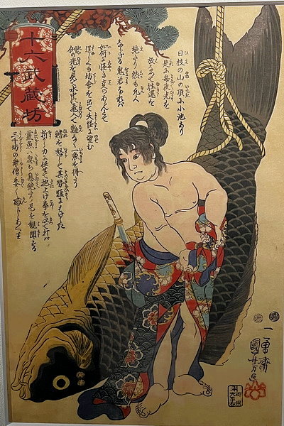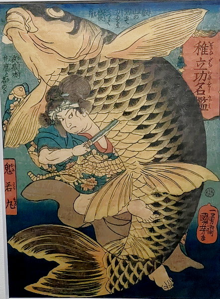 家喻戶曉,身穿紅色肚兜、擁有奇神怪力的金太郎,是力量與正義感的象徵,受人喜愛。江戶時代因為近松門左衛門(1653-1725)淨琉璃的劇作《嫗山姥》,人們更習以「怪童丸」稱之。傳說他是足柄山一位老婦人在夢見赤龍後懷上的孩子,天生勇猛無雙。後追隨源賴光,以「坂田金時」之威名震動四方,屢建戰功,成為賴光四天王之一,一同打敗大江山的酒吞童子。在國芳筆下,身形壯碩赤身紅膚的金太郎,無懼熊抱起一尾比人身巨大,奮力躍起的黑鱗錦鯉,流水奔湍,水花噴濺。〈坂田怪童丸〉江戶時代 歌川國芳約1836年作〈坂田怪童丸〉,私人收藏。描繪了一幅「金太郎與巨鯉」的題材,在江戶時代,這類圖像可能與祝願男子身強體健的寓意有關。黑錦碩大的軀體擺動著尾鰭,襯托出金太郎強健的體魄,飛濺的水花增添全景張力,動物的野性受雄壯的男子氣慨所懾服,生動詮釋金太郎的英雄形象。