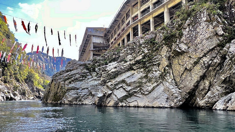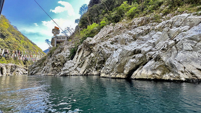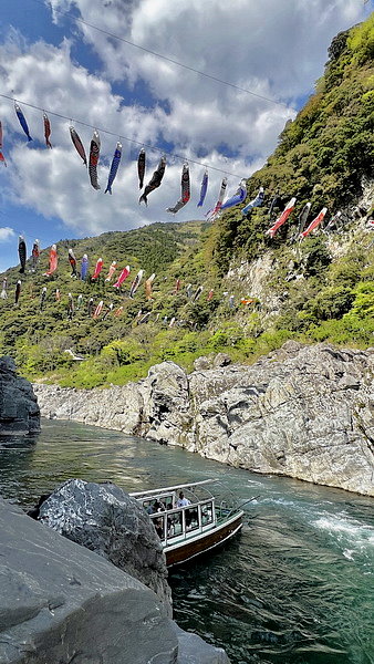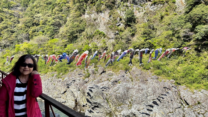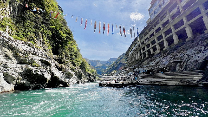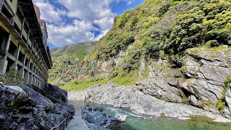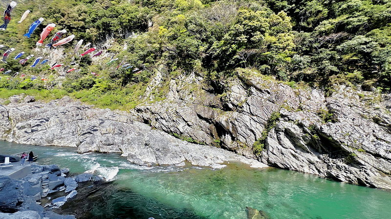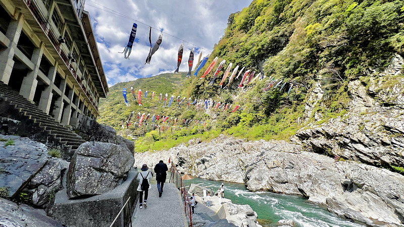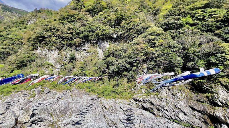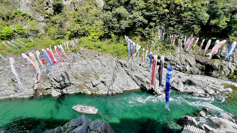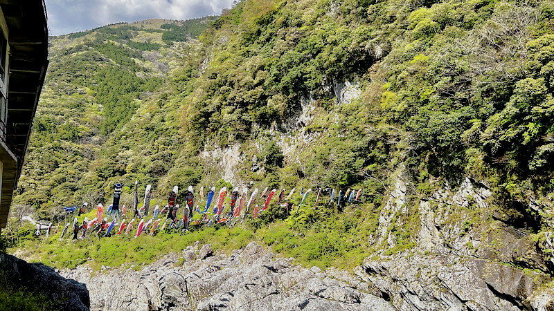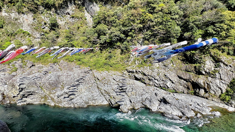 吉野川至國道側的溪流上方會掛起從全國各地收集來的鯉魚旗,在風中飄動的鯉魚旗如漂游川水之上,特別美麗。大步危峽每年4~5月會掛上色彩繽紛的鯉魚旗,鯉魚飄揚在峽谷之間,有種逆流而上的感覺,照片感受不到,其實鯉魚旗的尺寸非常巨大。
