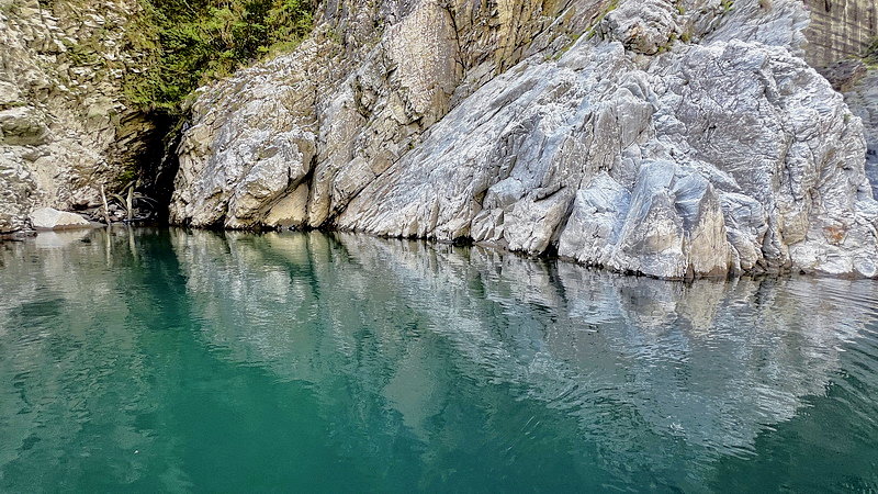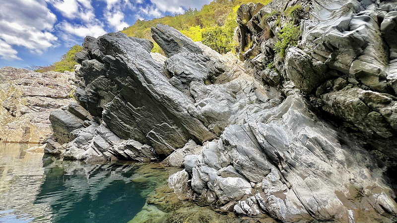 在這座由被水侵蝕的結晶片岩所形成的溪谷中,宛如大理石雕刻般的岩石處處聳立。