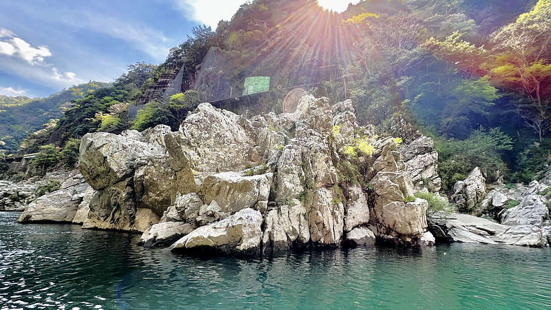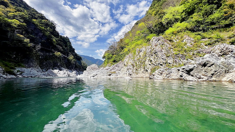 欣賞大步危峽谷風光搭船來回約45分鐘,免走路超輕鬆,就能沿著蜿蜒的峽谷溪流盡情欣賞壯麗美景。溪水清澈見底,水質乾淨得讓人驚嘆,沿途還會經過許多奇岩怪石,非常適合親子旅遊或銀髮族。