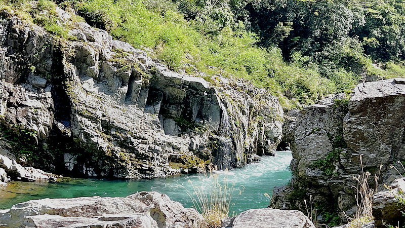 河川上游為大步危,下游處為小步危;不便的是大步危、小步危都是地形相當陡峭,每顆岩石都經歷過水的衝擊,進而形成如刀砍斧削一樣的景緻,其實有點類似台灣太魯閣的砂卡噹,都是壯麗的峽谷風貌。