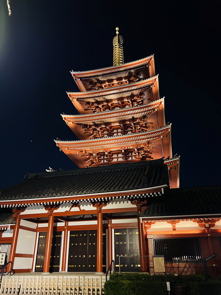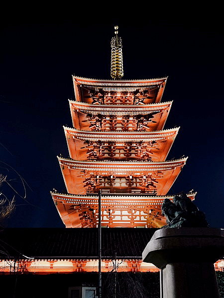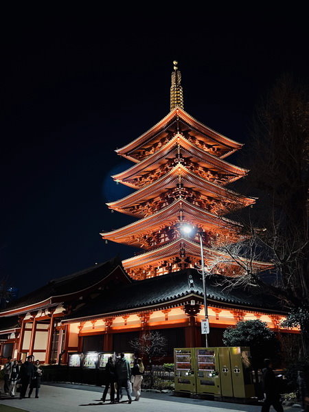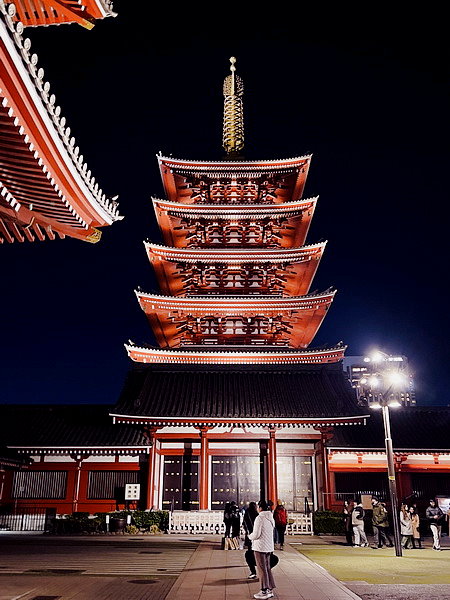 淺草寺五重塔,高約53.32公尺,相當於15到20層的建築。塔身外觀以鮮豔的朱紅色為主色調,白天和夜晚都能感受到不同的氛圍。當夜晚的燈光亮起時,更顯美麗,營造出夢幻般的氛圍,是遊客們拍照的熱門地點。